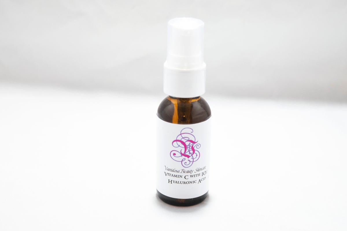 Our Vitamin C helps collagen production, lightens and brightens, improves the appearance of hyperpigmentation, and aids in sun damage protection. while the hyaluronic acid offers deep cellular moisturizing and hydration